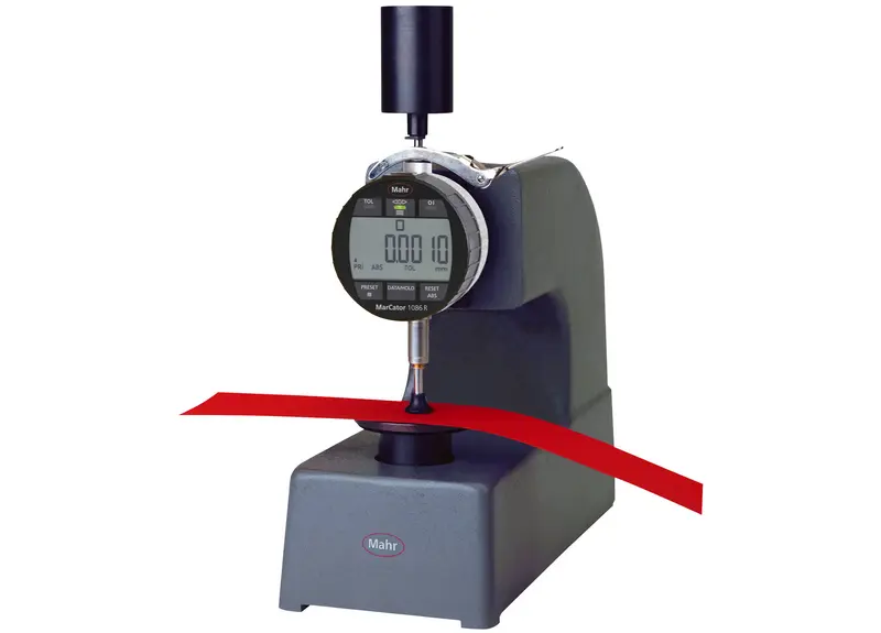 Thickness Gage. The portable thickness gage raises the ante on resolution by combining a flat anvil-type reference surface on the bottom with a radiused (ball) measurement contact on top. Making a single point measurement eliminates the possibility of gage error that could be caused by faulty parallelism of the contacts. This would be a good gage for a narrow strip of photographic film where a spot check of thickness is required.