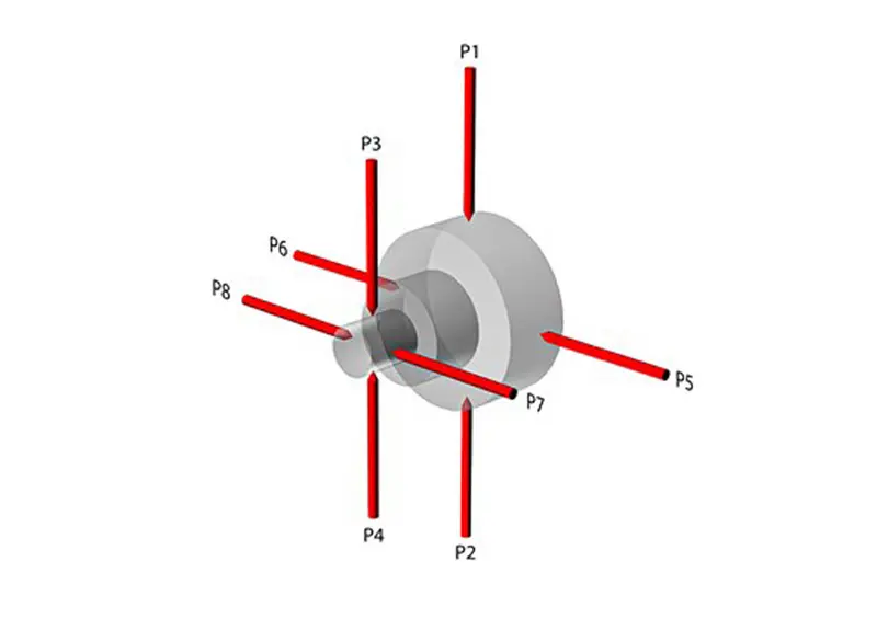 The image labeled figure 1 shows a fixture gage probe layout for doing a concentricity measurement using eight probes in a static test of concentricity. The equation for concentricity looks at probes that are measuring diameters. For example, in this diagram, probes P1 and P2 can be used for measuring a diameter. They also can be used to find the center of the small shaft diameter, while P3 and P4 are used to find the same shaft diameter center but at 90 degrees relative to the first calculation. The same is done on the large-diameter end of the shaft. Then, through the calculations, a comparison is made between one center and the other for the concentricity relationship. It’s not as pure as a concentricity check on a form system — but by using an amplifier system with a little computing intelligence, an indication of concentricity can be provided instantaneously. In a high-volume production environment, this can save hours of daily production time.
