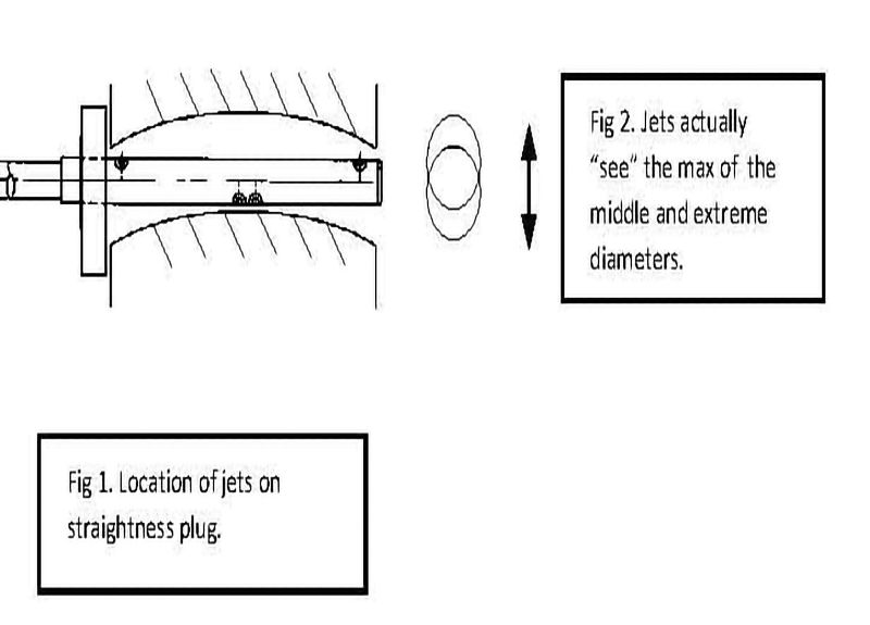 But as the plug is rotated through 180 degrees exploring the bore, the pairs of jets will experience a maximum clearance and then find the minimum clearance, usually at right angles to each other. This difference between the maximum and minimum value is the out-of-straightness condition as seen over the total length of the plug measurement length.